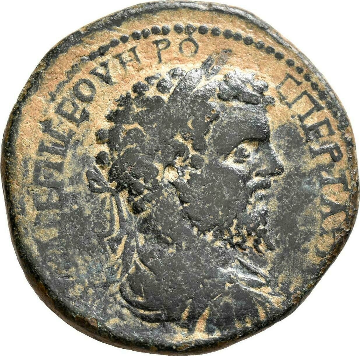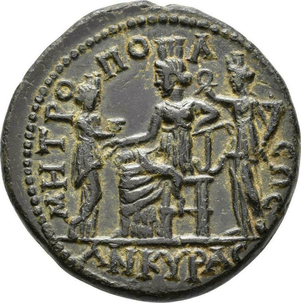 Tyche seated left, holding patera in her right hand and leaning left on anchor set on throne, being crowned by another Tyche standing behind her, head to left, holding cornucopia in her left hand; to left, a third Tyche standing right, holding vessel or crown (?) in her right hand. |