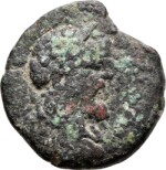 Tyche standing left, right hand resting on a long sceptre, holding a cornucopia in left; at feet to left, heifer standing left; Marnas symbol to left c/m: five-pointed star within rectangular incuse