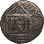 temple with four columns enclosing statue of Zeus seated right, holding thunderbolt and long sceptre