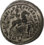 Caracalla (?) on horseback, right, holding spear in right; below the horse, bound captive |