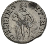 Heracles standing facing, head right, holding club and lion skin