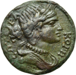 draped bust of Kore Soteira wearing wreath of corn ears, right;
