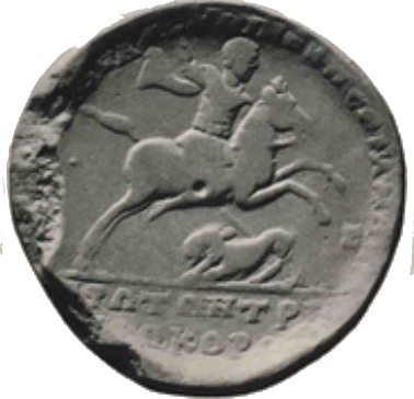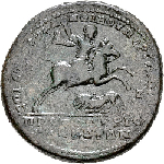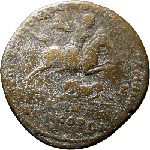 Caracalla on horseback right, rising left arm, at gallop; below the horse, lion standing left |