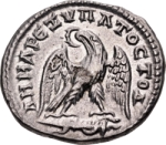 eagle standing facing, wings spread, head and tail left, wreath in beak; below, torch with serpent entwined, right