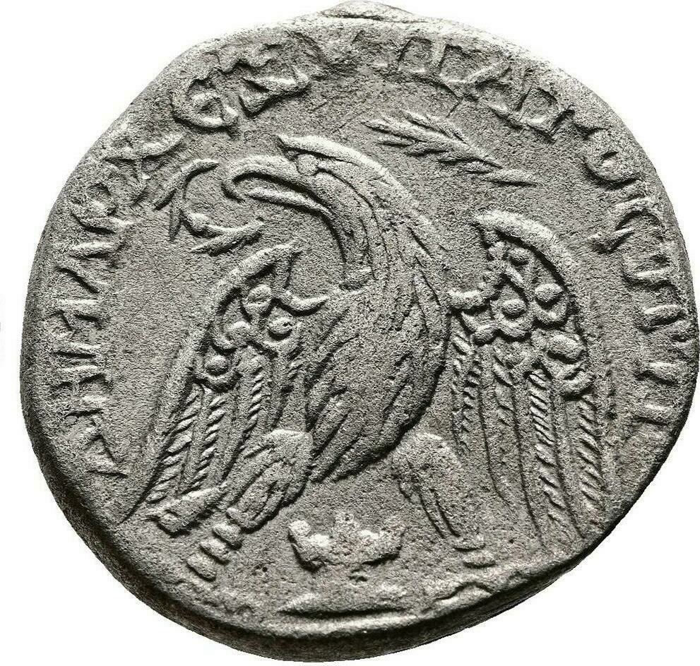 eagle standing facing, head and tail left, with wings spread, holding wreath in beak; small horned altar between the eagle's legs; palm in upper right field |