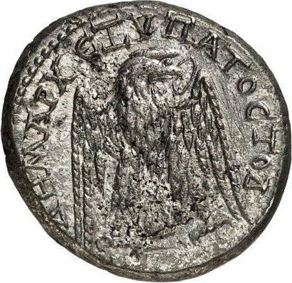 eagle seen from front, with wings spread, head right, no tail, wreath in beak; between legs, shrine with pediment