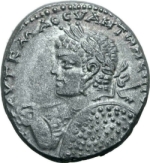 laureate, draped and cuirassed bust of Caracalla, left, seen from front, holding sceptre on right shoulder and shield on left