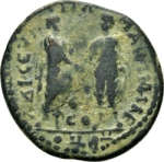 Caracalla and Geta in toga standing looking at each other, clasping right hands |