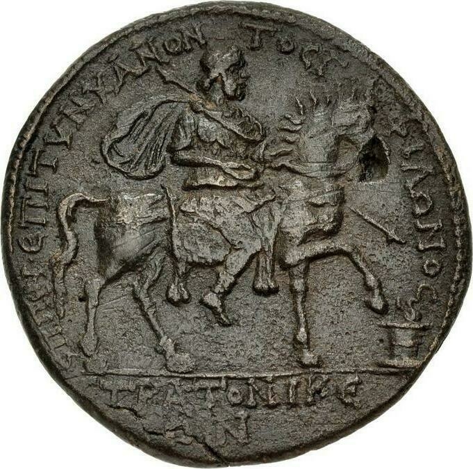 Zeus Panamaros on horse advancing, right, holding sceptre; to right, altar |