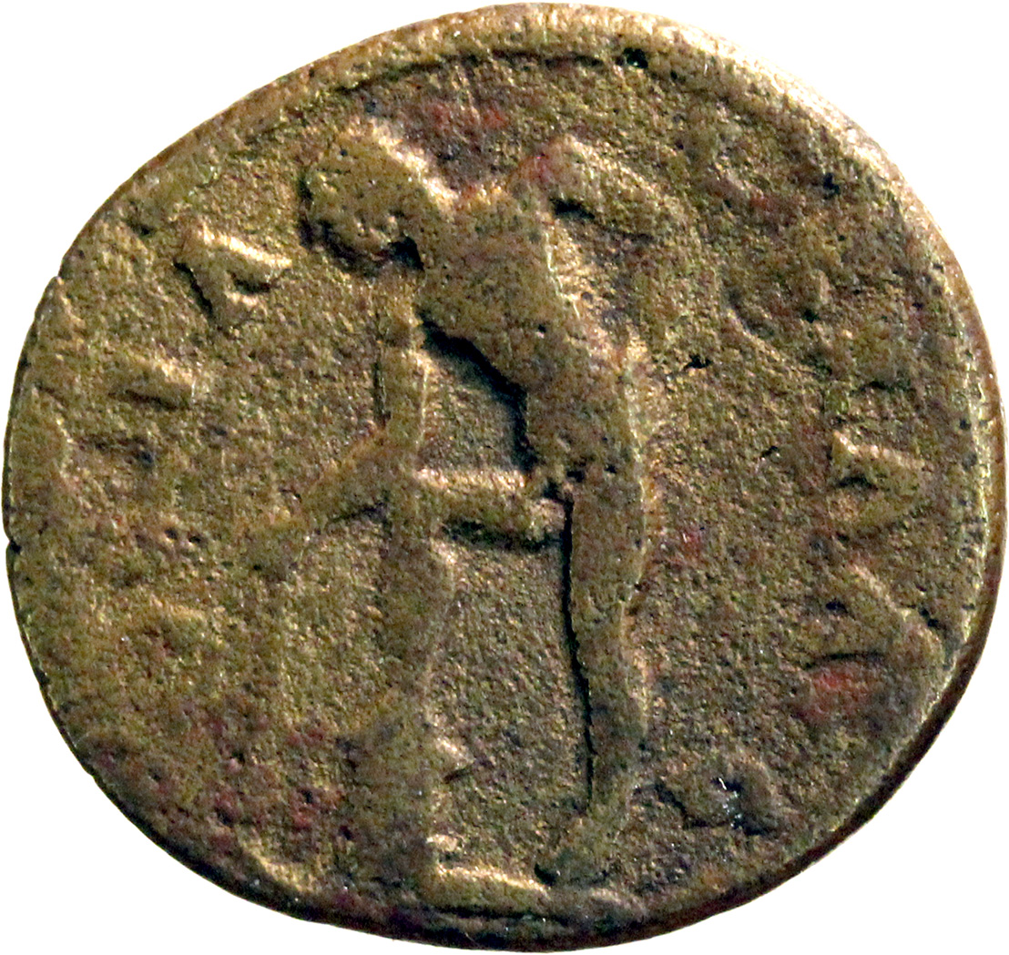 nude Apollo standing with foot on omphalos(?), left, leaning forward, resting elbow on knee, holding branch