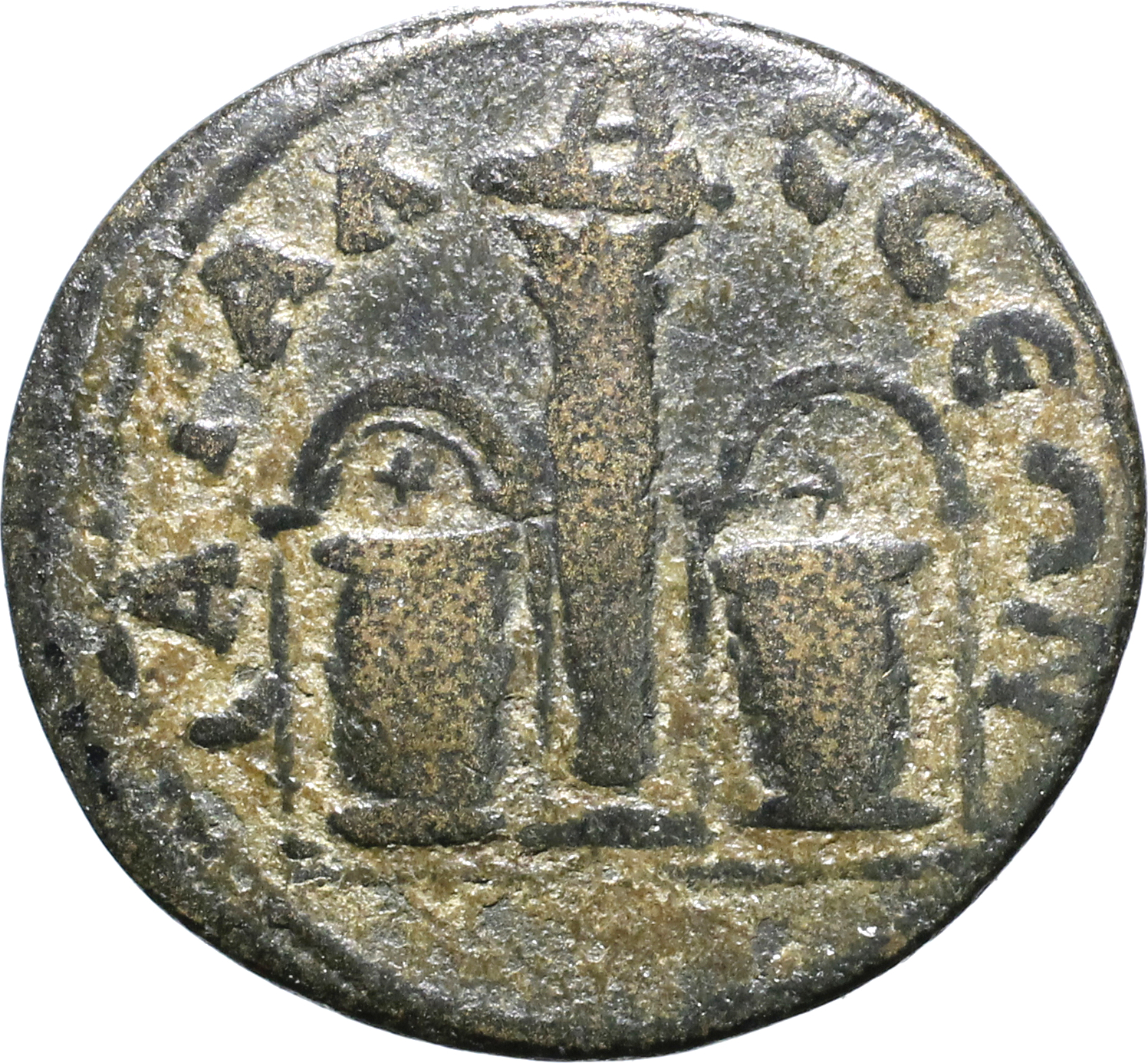 column between two altars (of the Dioscuri), each altar decorated with star and crescent, in aediculae