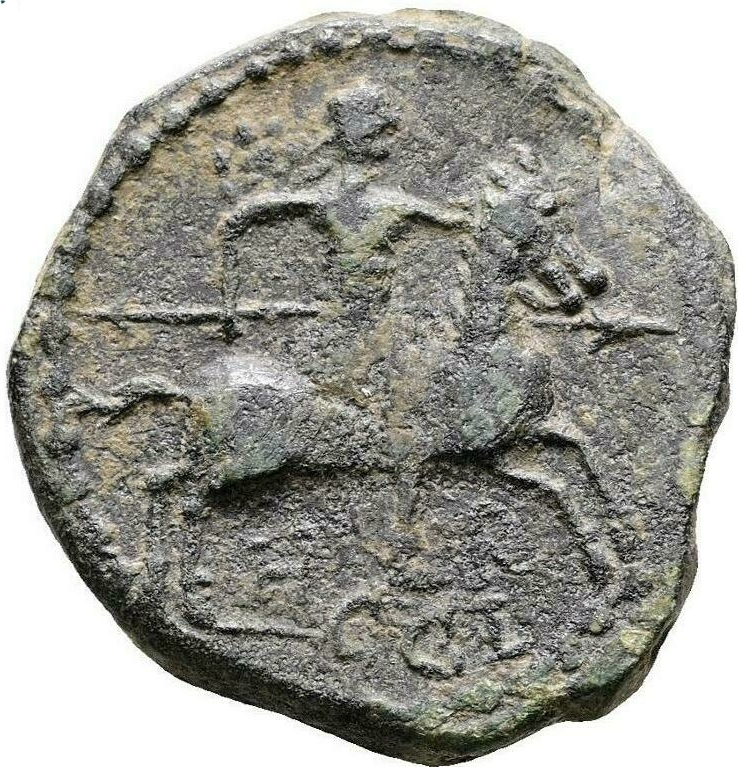emperor riding on horse right, cloak billowing behind, holding long spear