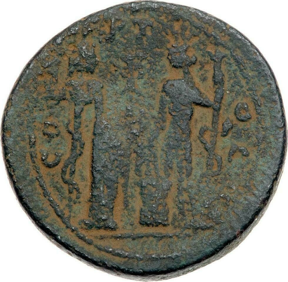Ceres and Proserpina (?), standing, facing each other, holding ears of corn and sceptre entwined by serpent; between them, serpent raising from altar and caduceus