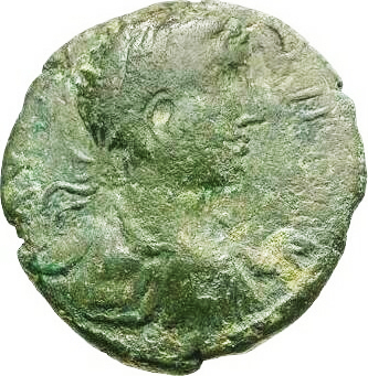 laureate, draped and cuirassed bust of Geta (?), right, seen from rear