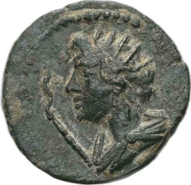 radiate and draped bust of Helios, left; in front, torch
