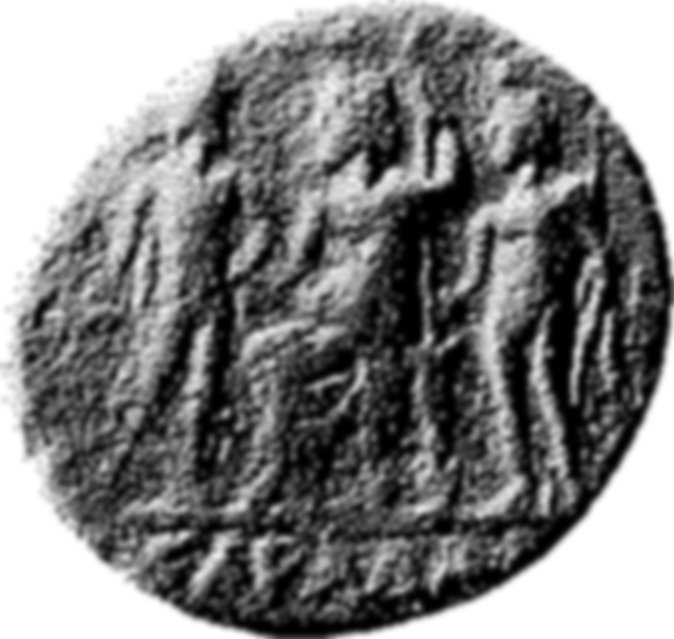 Zeus seated left, holding sceptre and patera; to left, nude male figure standing right, holding patera?; to right, another nude male figure standing left, holding spear
