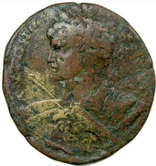 laureate, draped and cuirassed bust of Caracalla, left, seen from front, holding spear and shield decorated with aegis