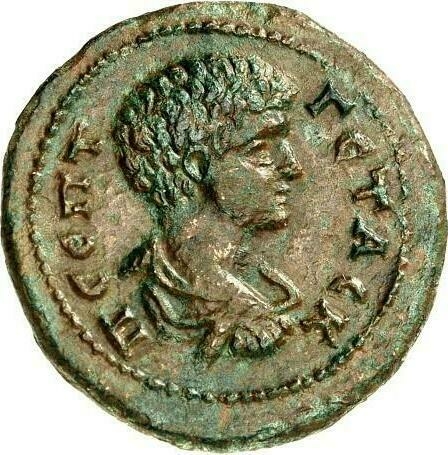 bare-headed, draped and cuirassed bust of Geta, right, seen from rear