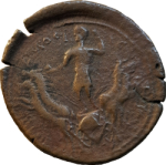 Caracalla standing facing in military dress, head left, holding long sceptre and globe, in quadriga galloping to front |
