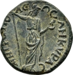 Athena standing facing, head right, holding owl and spear; to left, shield