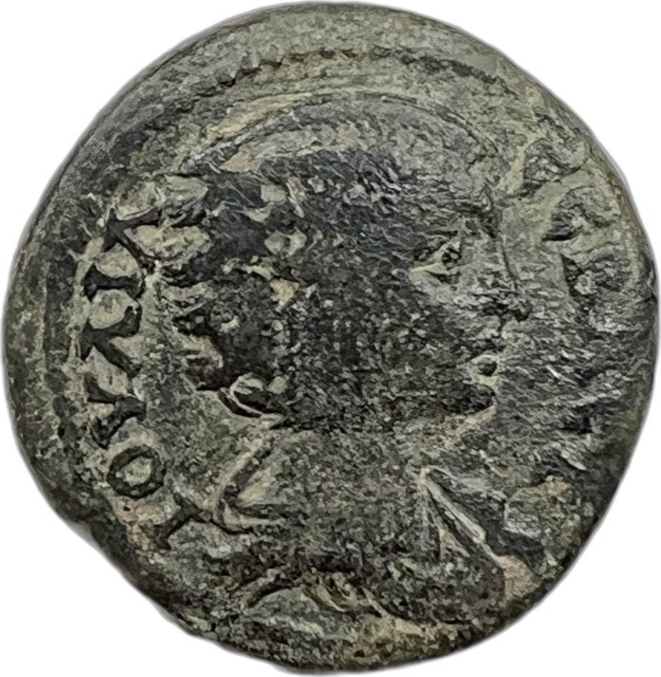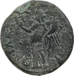 Tyche Pantheia standing left, winged, holding wreath over wheel and cornucopia