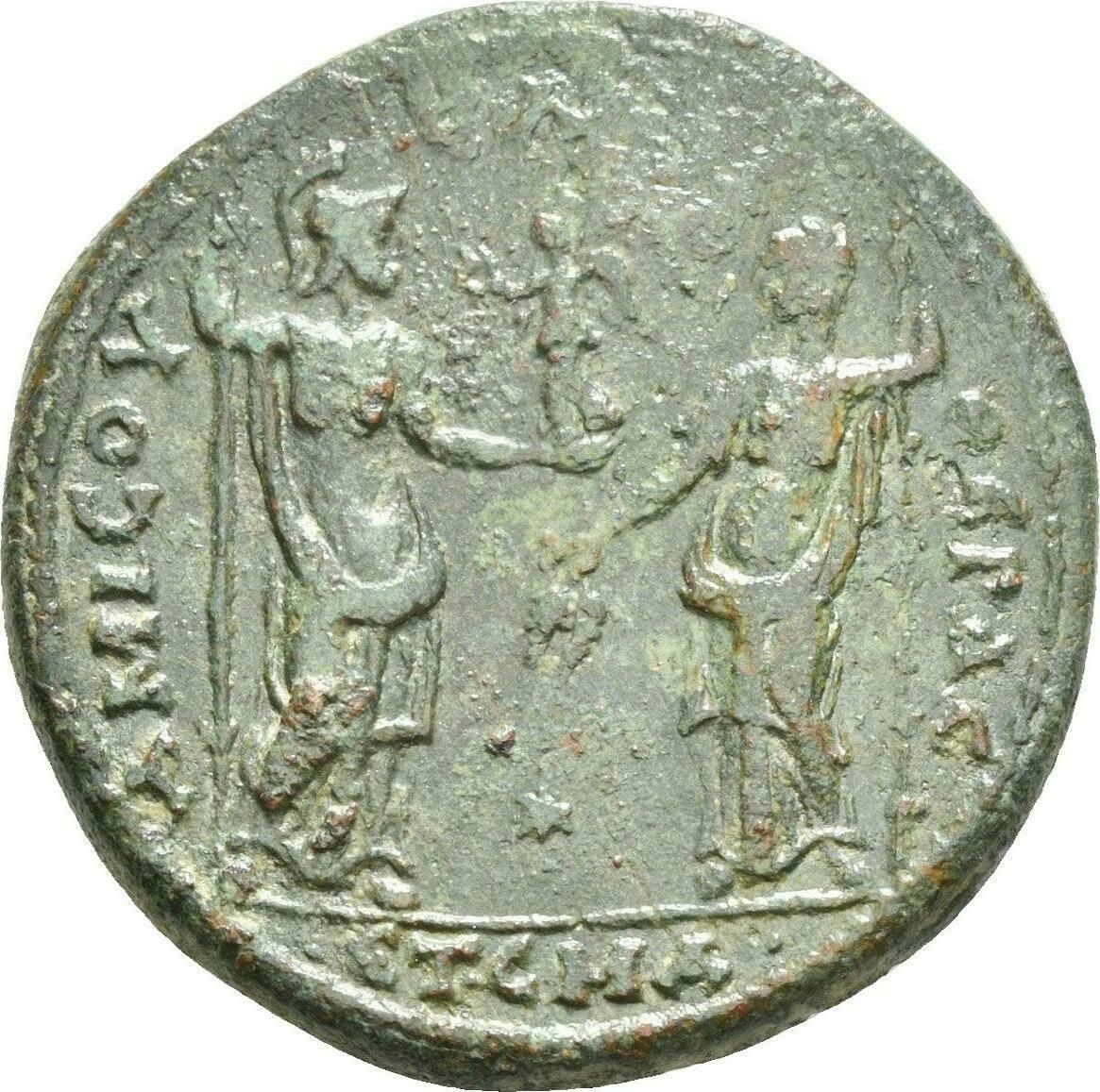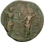 Athena standing facing, head right, resting on spear and holding Nike facing Demeter standing facing, head left, holding ears of grain and resting on sceptre