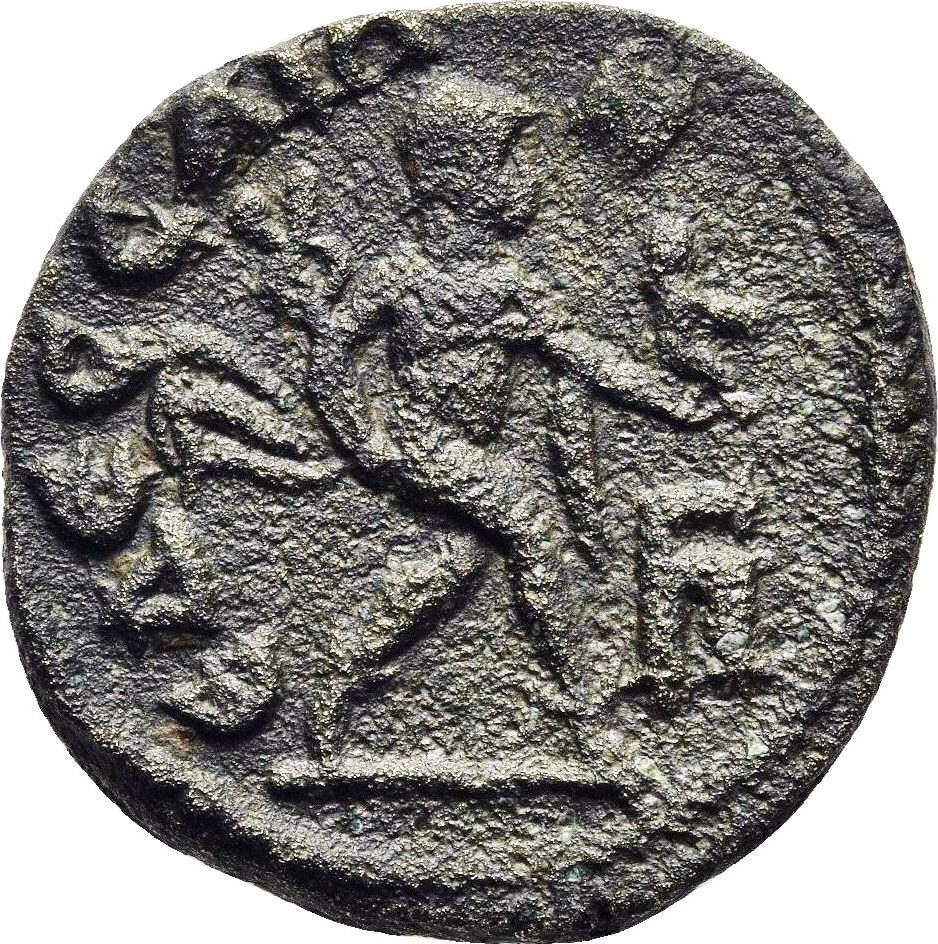 Hermes advancing right holding caduceus and small figure of Dionysus