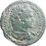 temple with six columns enclosing statue of Caracalla standing left, togate, holding patera (and roll?) |