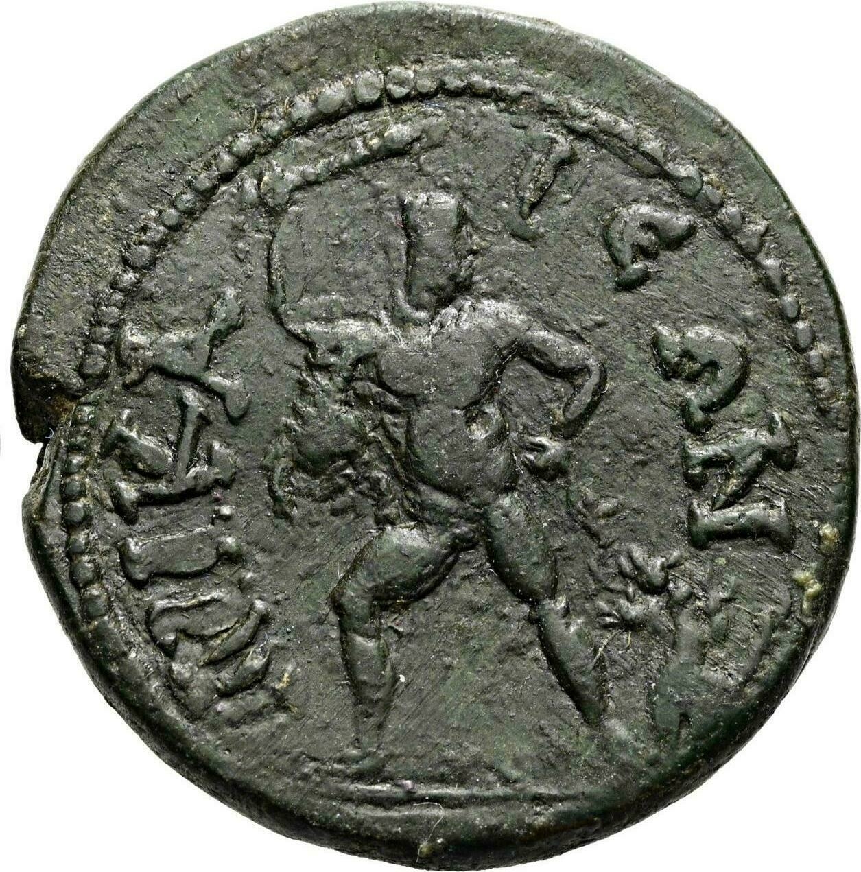 Heracles nude advancing left, looking right, holding club in his upraised right hand, his left on his hip; at his feet, right, Cerberus