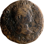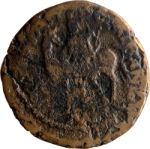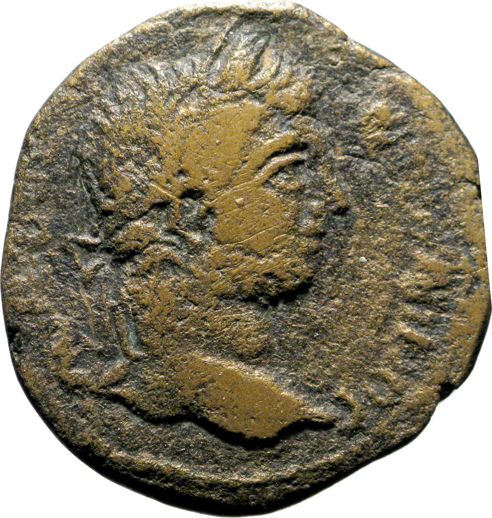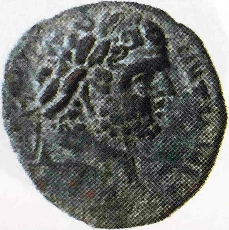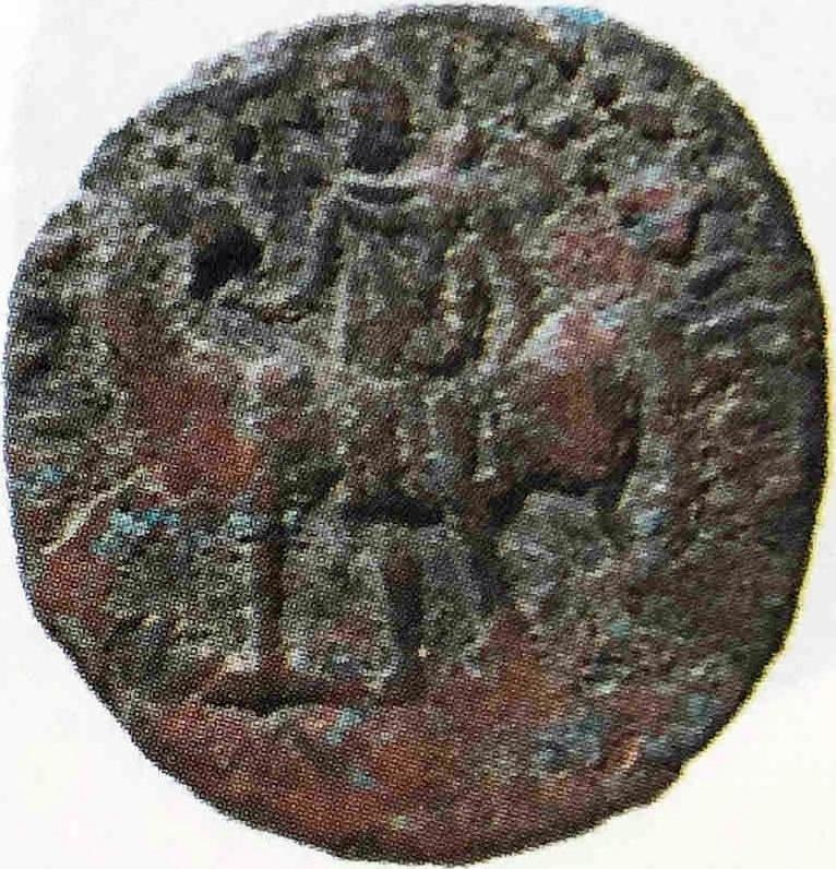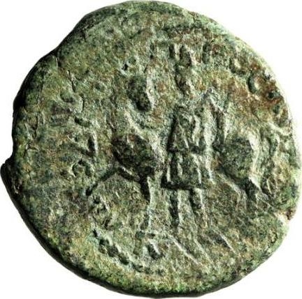 Mên standing facing, head left wearing Phrygian cap, crescent behind shoulders, holding sceptre in left hand and in right bridle of horse standing left behind him, looking back |