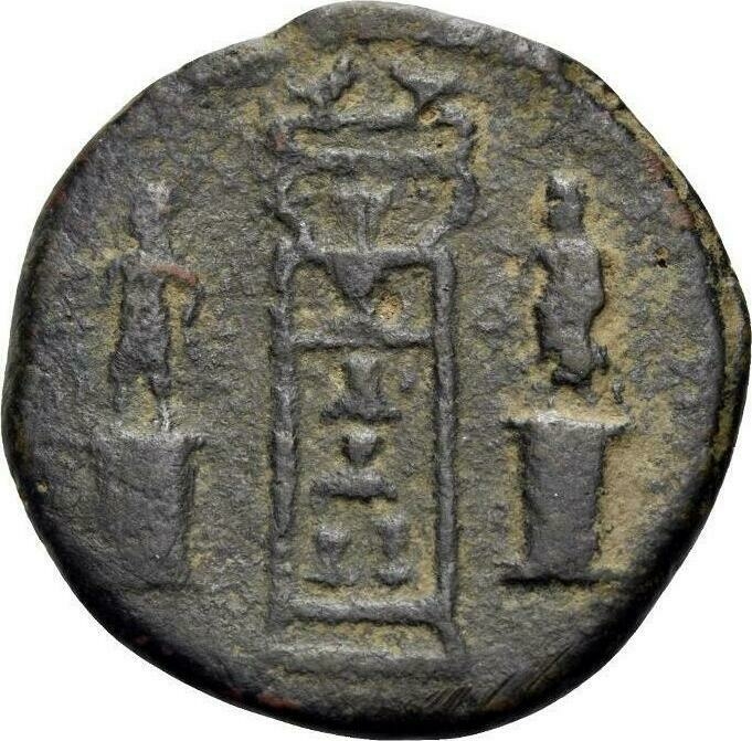 cult monument decorated and topped by caduceus; on either side, statues on bases, to left, Heracles leaning on club, to right, Zeus(?) standing with patera