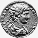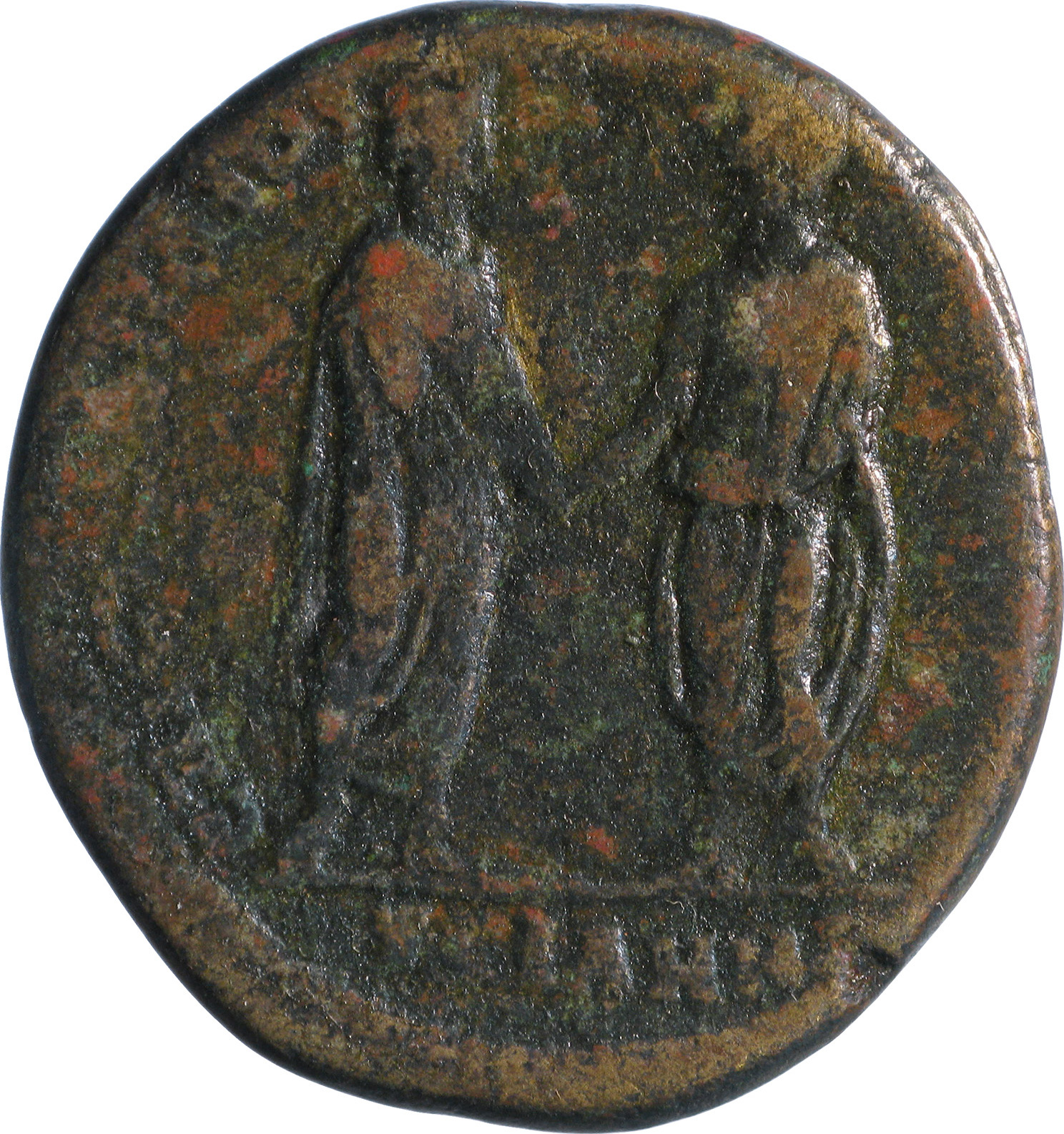 Caracalla and Geta standing, facing each other, clasping hands, each wearing toga |