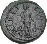 Nemesis standing left, raising fold of dress with her right hand, holding bridle in left; at her feet, wheel
