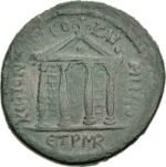 temple with four columns with wall within intercolumnations left and right; pellet in pediment