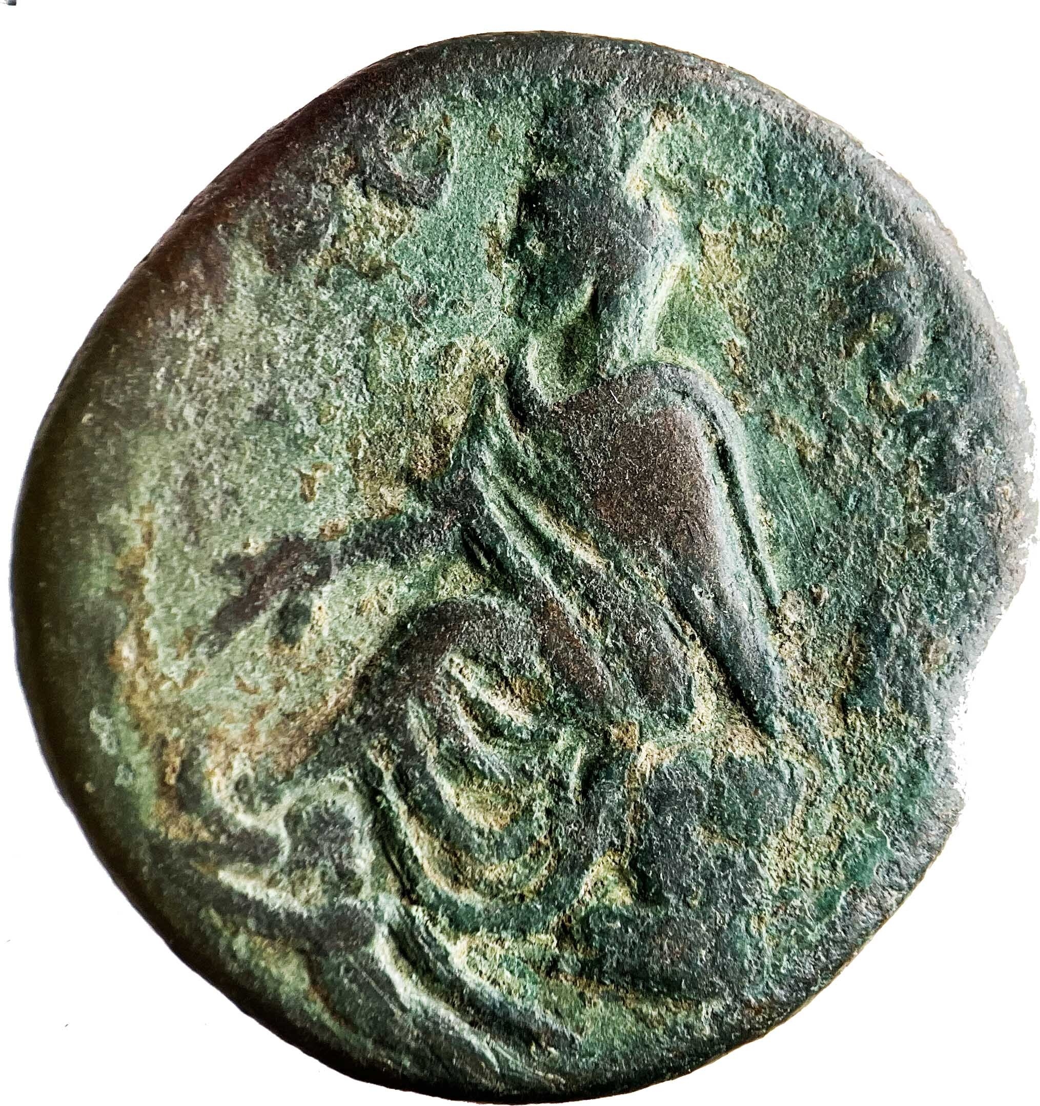 Tyche seated left, on rock, holding out corn ears; below, river god
