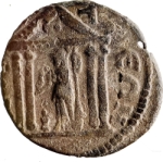 temple with four columns enclosing cult statue of Athena standing left, holding spear and Nike (?); at feet, owl on cippus and shield