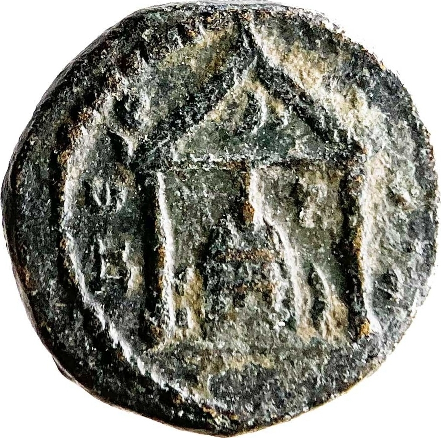 temple with two columns enclosing cult statue of Artemis Pergaia between star and crescent and flanked by two short columns surmounted by sphinxes; eagle in pediment
