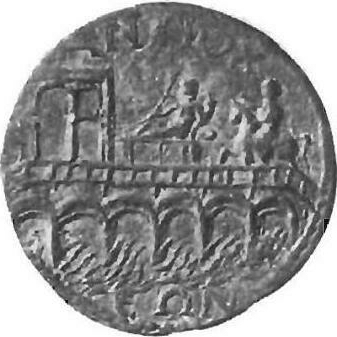 bridge, on which river god reclines on kline left, holding reed and cornucopia; to left, triple-arched gate; to right, man on horse