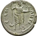 Mên standing facing, head right, holding sceptre and Nike; foot on bucranium; to left, cock