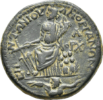 Tyche seated left, on rocks, holding rudder and cornucopia; below, river-god Chrysoroas swimming left |
