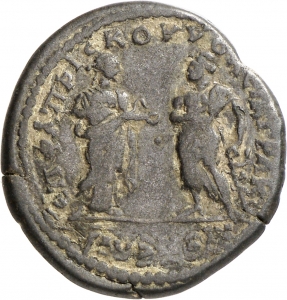 Hygieia standing right, feeding serpent from patera, facing Asclepius standing left, holding serpent staff |